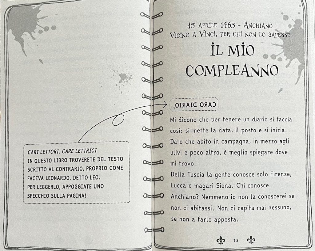 Il diario di Leonardo fa parte di una collana che riesce a trasformare grandi personaggi della Storia in compagni d’avventura, avvicinando i più piccoli alle loro figure con leggerezza, umorismo e tanta fantasia. Il libro è arricchito da bellissime illustrazioni in bianco e nero e da un’idea geniale: alcuni messaggi nel diario si possono leggere solo con l’aiuto di uno specchio, proprio come faceva il vero Leonardo! Un gioco interattivo che rende la lettura ancora più magica. Quindi, un libro perfetto per lettori curiosi, inventori in erba e piccoli spiriti liberi che, come Leonardo, non smettono mai di farsi domande! E se le avventure del giovane Leonardo vi sono piaciute, provate gli altri Strampalatissimi diari, tra cui “Babbo Natale” e “Cenerentola“.